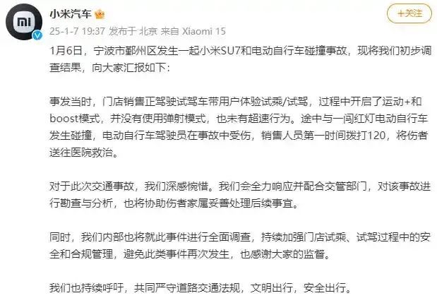 1月6日,宁波市鄞州区发生沿途小米SU7和电动自行车碰撞事故,小米汽车1月7日发布初步打听已矣。