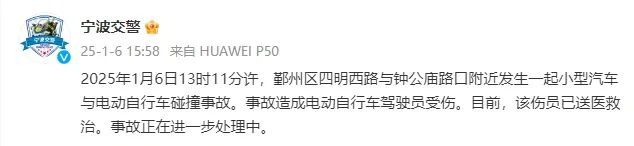 宁波交警发布的一则秘书表露,2025年1月6日13时11分许,鄞州区四明西路与钟公庙路口近邻发生沿途袖珍汽车与电动自行车碰撞事故。事故酿成电动自行车驾驶员受伤。现在,该伤员已送医救治。事故正在进一步处理中。