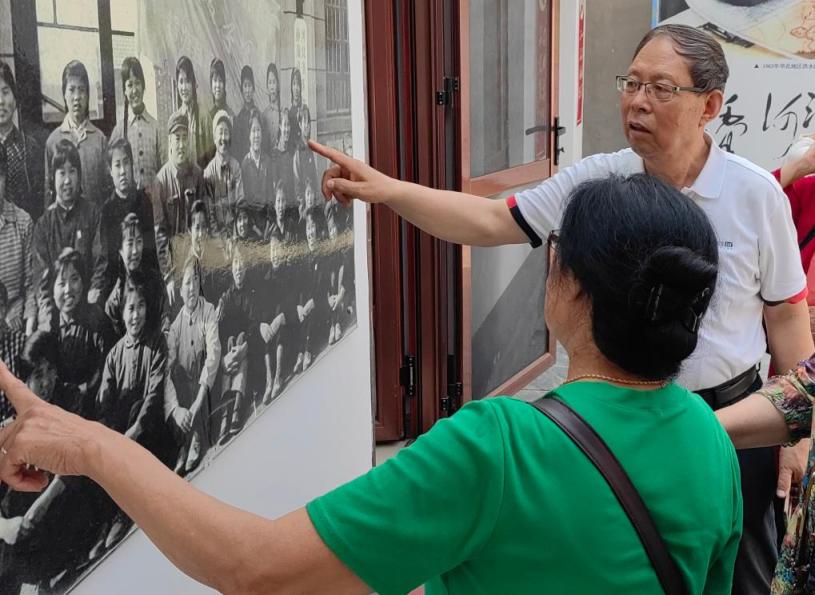 夙昔参与根治海河工程的“铁密斯排”女队员与馆长魏宗宽在合影照前指认夙昔的我方(贵府相片)。新华社发(王强 摄)